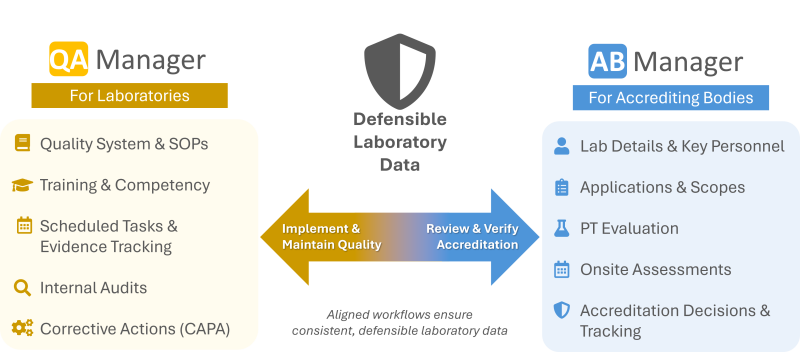 Laboratories implement and maintain a quality system. Accrediting bodies review and verify that system. Most programs rely on disconnected tools—spreadsheets, email, and manual tracking.